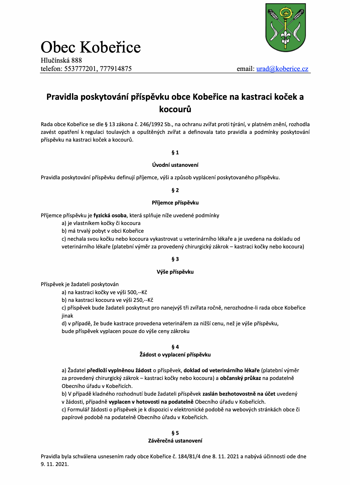 Byli jsme informováni občany Kobeřic, že obec zrealizovala vlastní kastrační program s účinností od 9.11.2021. Další detaily vyzjistíme.