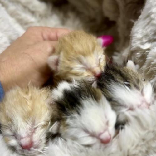 Nález 4 koťat několik dní starých, v obci Košíkov. Koťata jsou krmena lahvičkou při intenzivní péči.