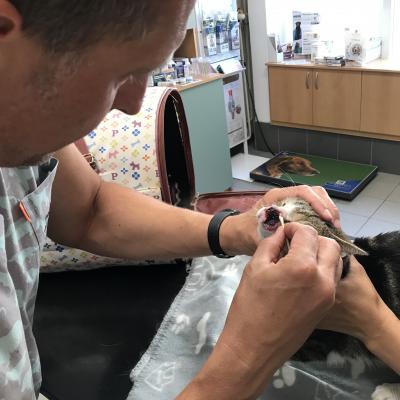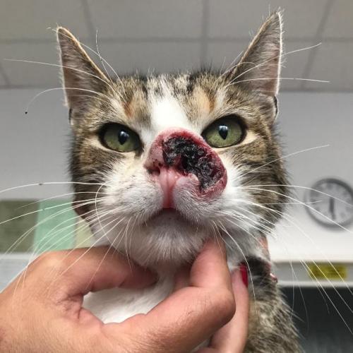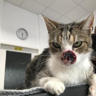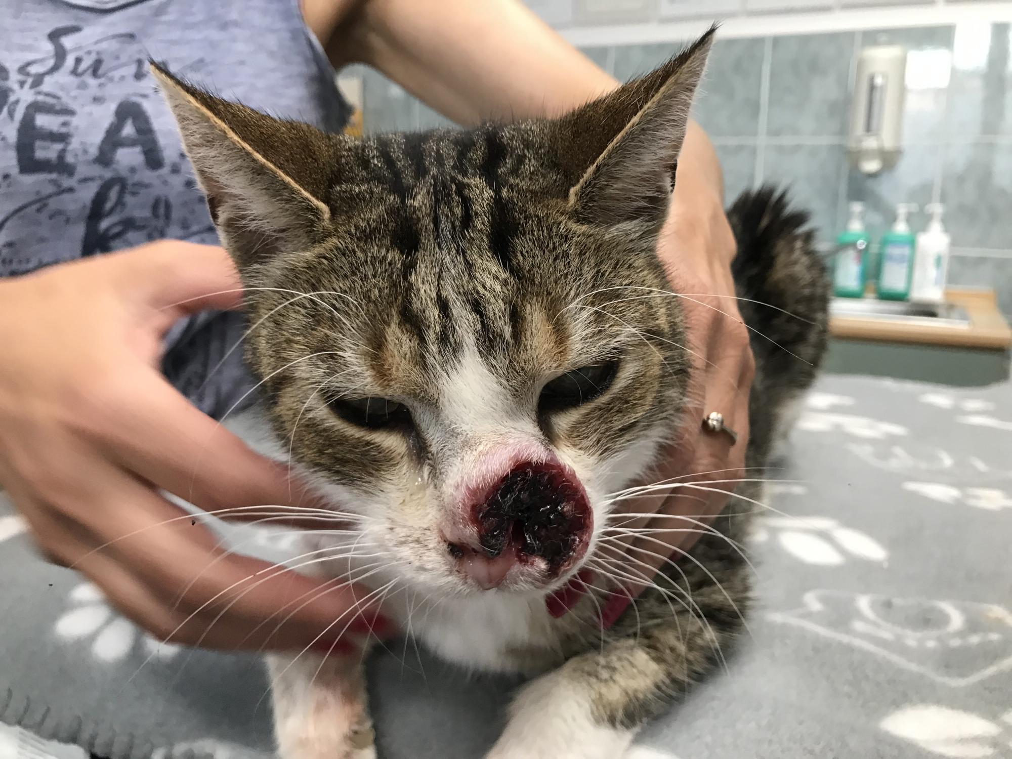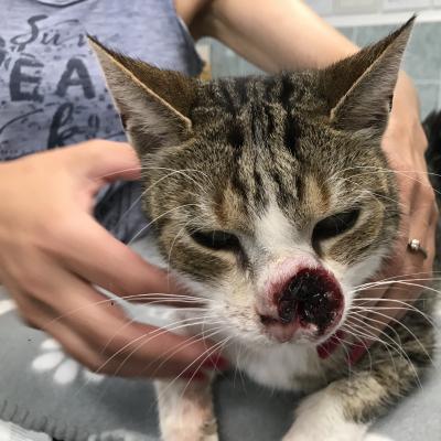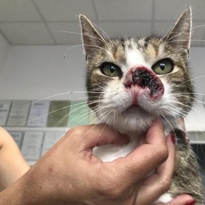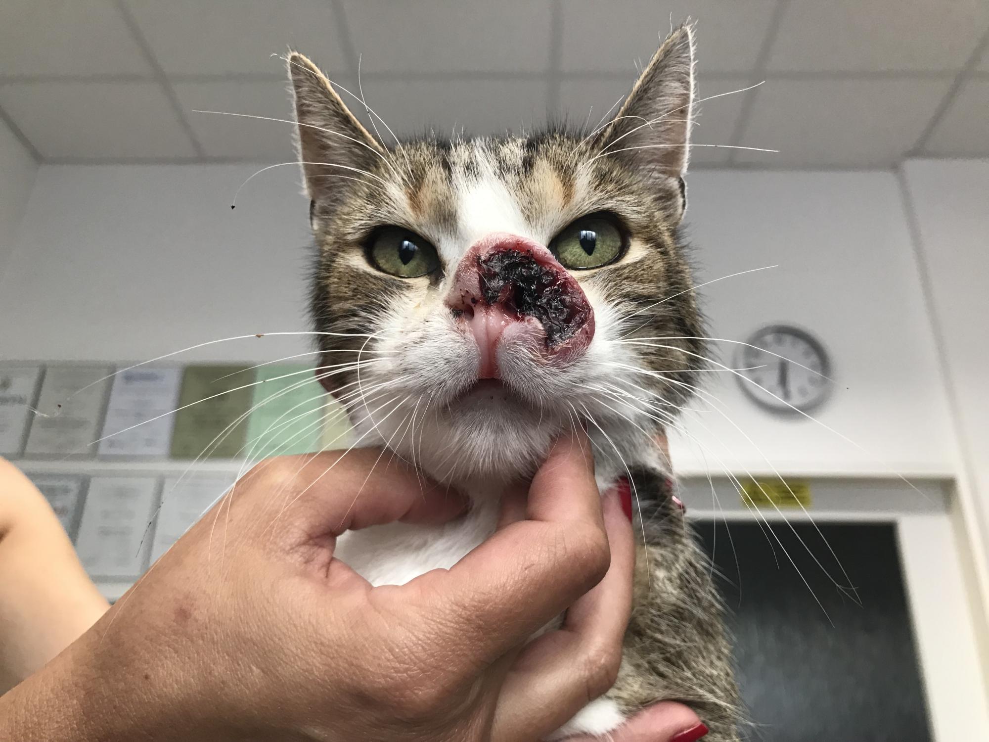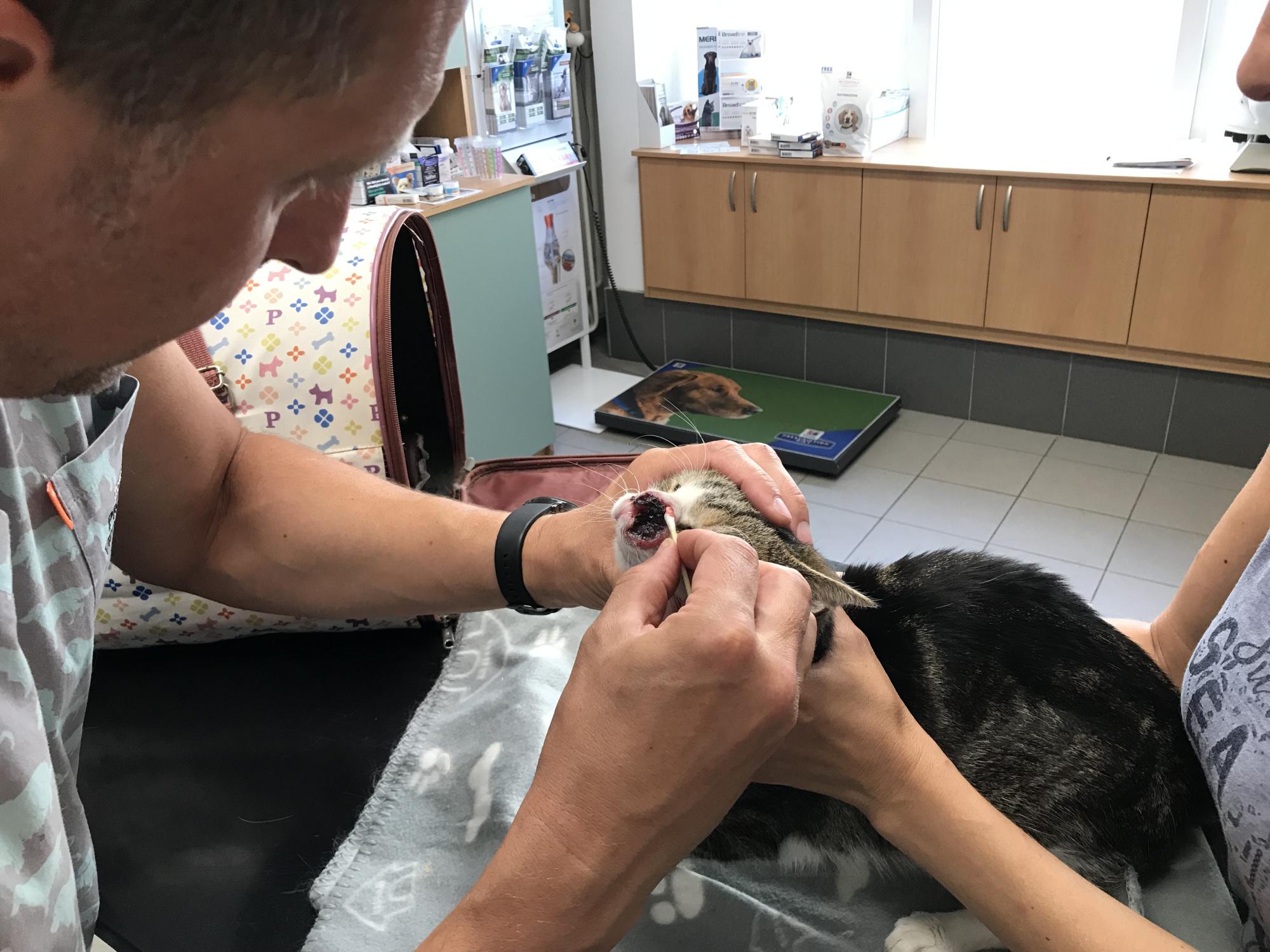 Odvezli jsme kocoura k MVDr. Petrlíkovi, aby ho prohlédl a udělal vyšetření. Kocourek je odhadovaného stáří cca 8 let, je kastrovaný (!) a začala se u něj projevovat pohublost. Doktor bohužel konstatoval zhoubný nádor, ale nikdo neumí předpovídat, jak rychle a dramaticky bude růst, zvlášť když není známa předchozí anamnéza. Ukázalo se, že má kocourek citlivé zuby, takže jsme ho nechali do rána hospitalizovat a dnes jsme pro něj jeli. Bohužel se při podrobném vyšetření ukázalo, že celá vrchní čelist je už napadená a nádor prorůstá do kosti, takže proběhla extrakce všech vrchních zubů (mimo řezáky) a čtyř stoliček na spodní čelisti. Kocourkovi se výrazně ulevilo a také testy na FeLV a FIV jsou negativní, další rozbory příjdou přístí týden. Podle všeho nádor zasáhl i slzné kanálky a tak kocourek vypadá, jakoby stále plakal, navíc se mu těžko dýchá zkrz zuženou nosní dírku, která mu zůstala. Operace je kvůli rozsahu onemocnění nemožná. Nakonec se našel majitel, kterému byl vrácen. Bruce se ve skutečnosti jmenuje Čikin.