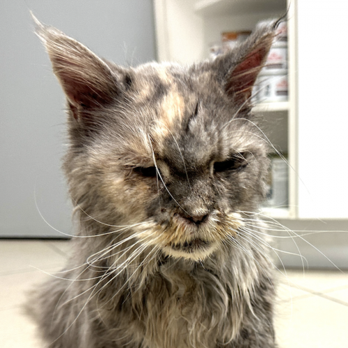 Kočka nám byla svěřena městským útulkem jako adept na uspání. Zjevně ji bolí zuby, ale nejdřív musí přijít do kondice, aby mohla podstoupit operaci. Dále je podezření na entropii obou očí. Byla silně zablešená a zklíštěná (přes 70 klíšťat). Nyní je v intenzivní péči.