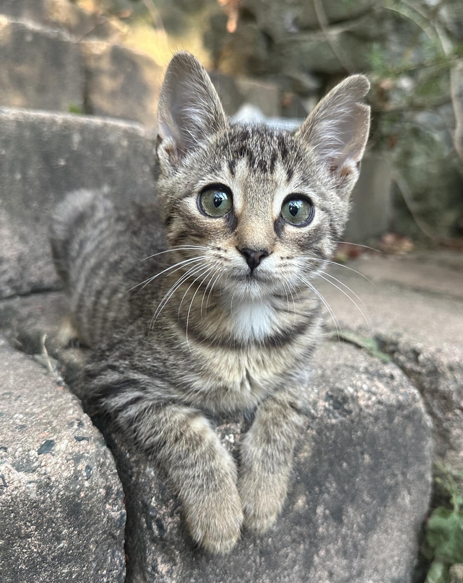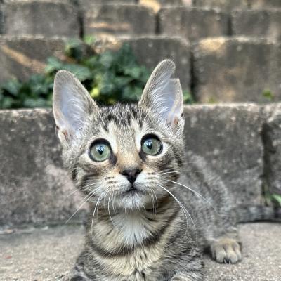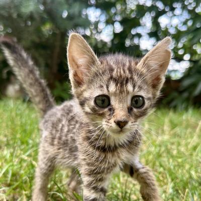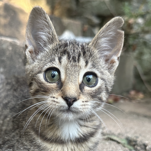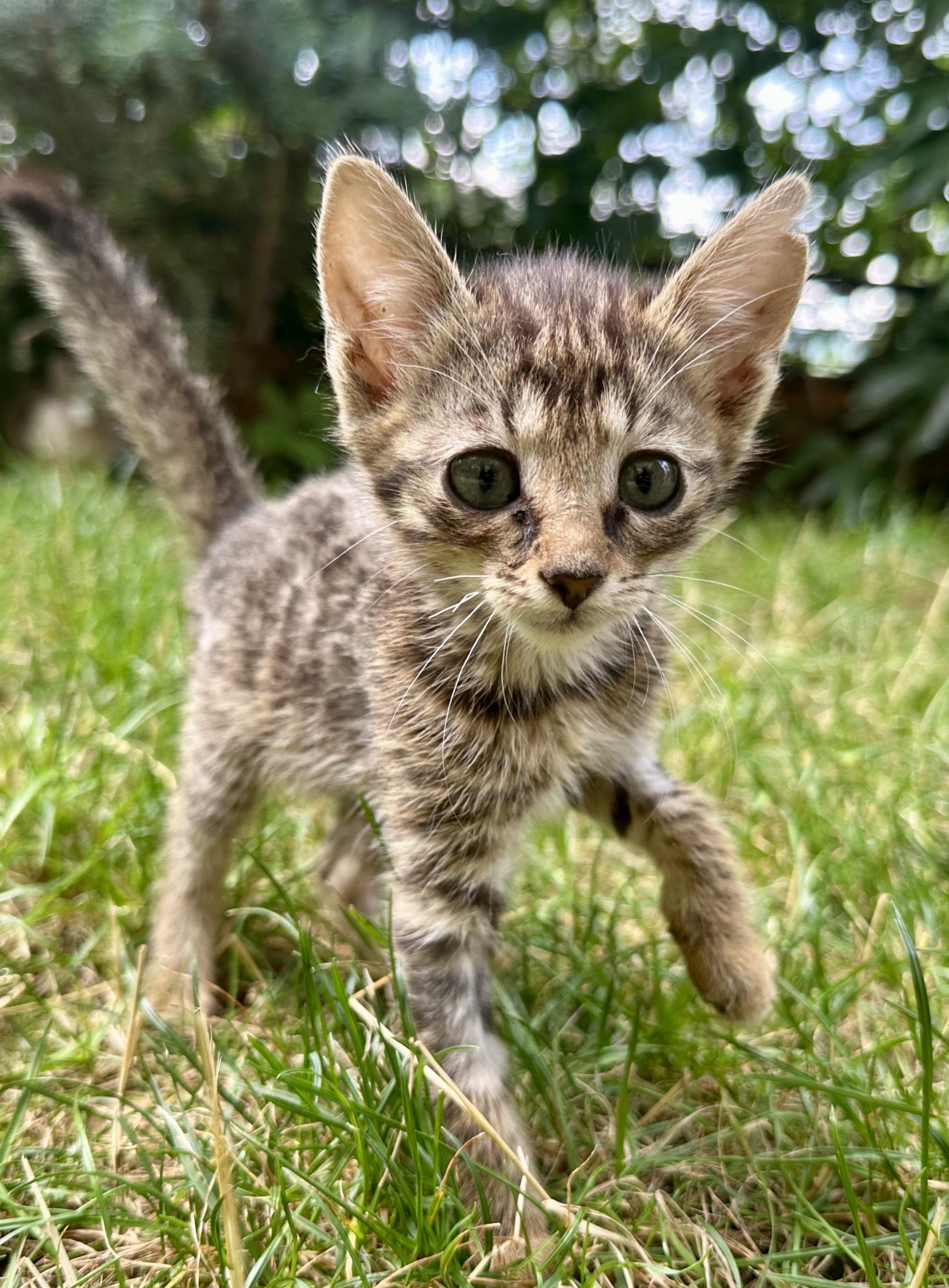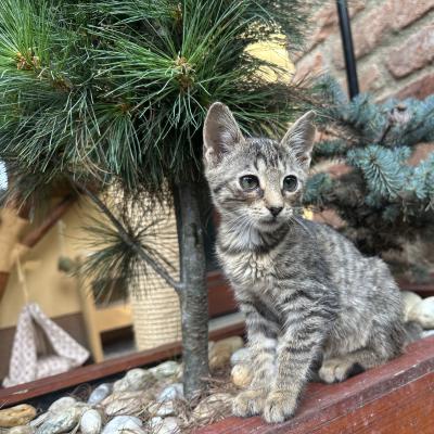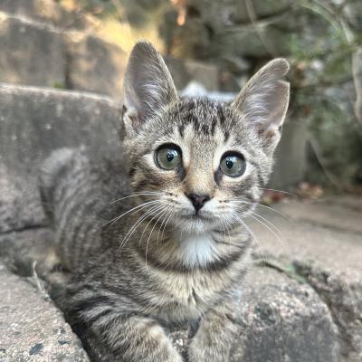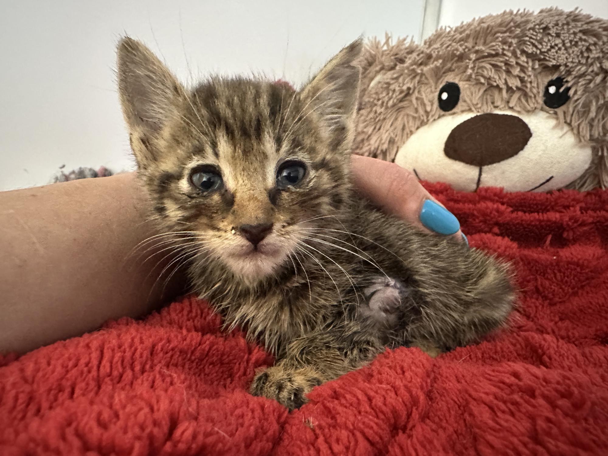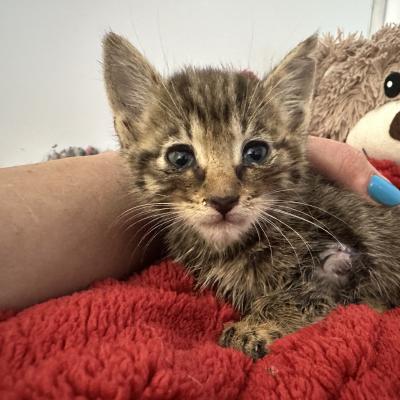 4 týdny staré kotě nělezeno vykastrované, bez rekonvalescence a v dezolátním stavu, včetně poškozeného kloubu přední nohy.
