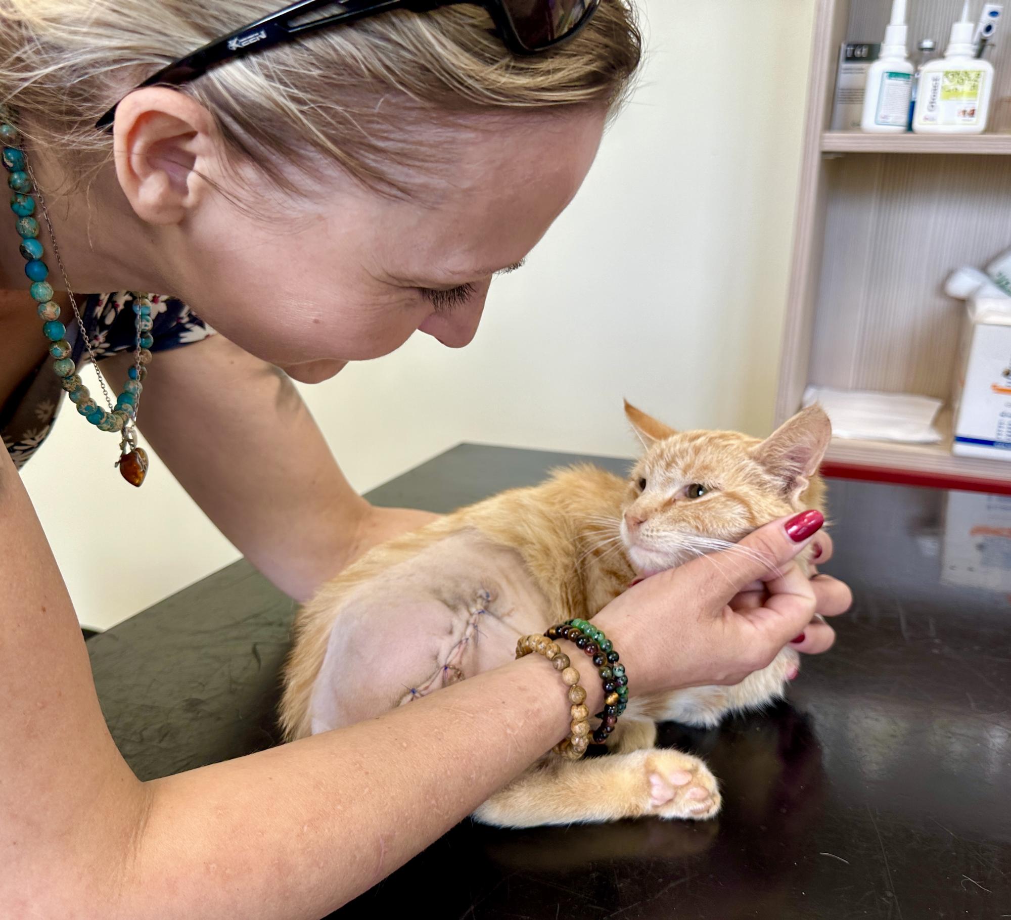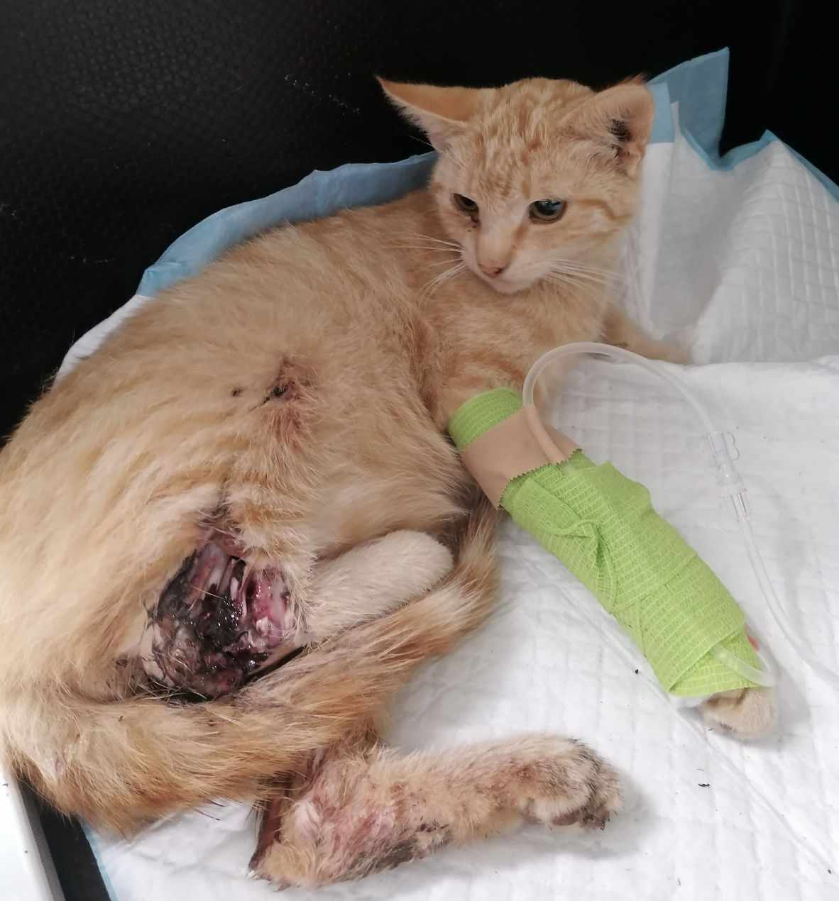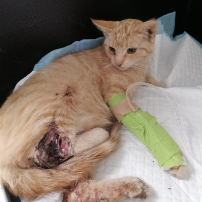 Kocour losínek byl zraněn při kosení luk velkou sekačkou či kombajnem. Musela mu být amputována noha a nyní je v naší péči.