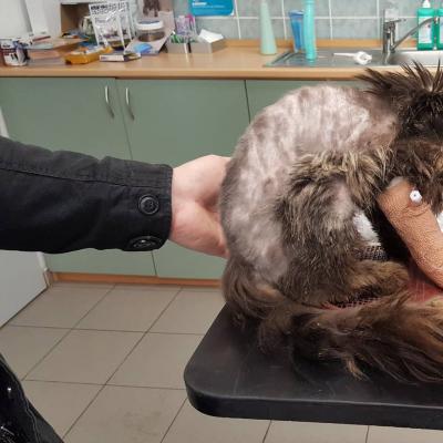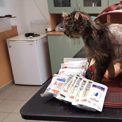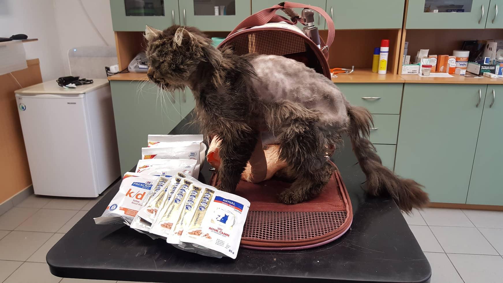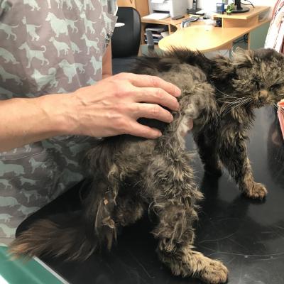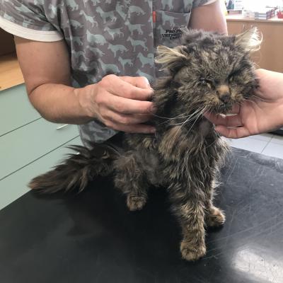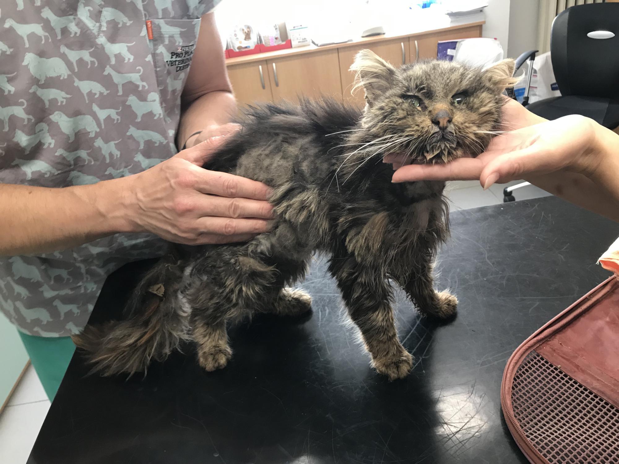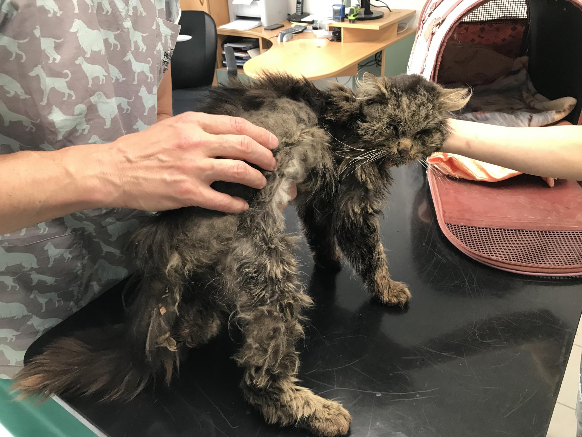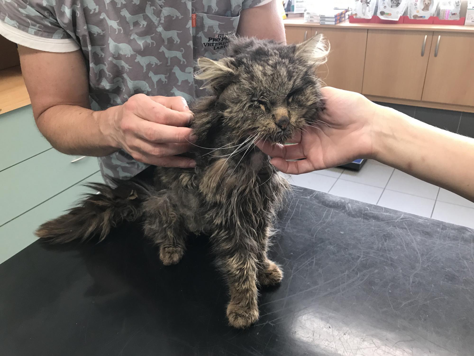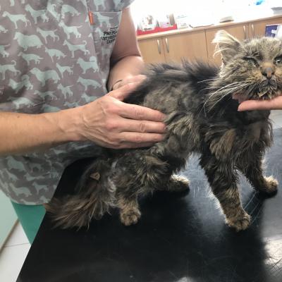 V odpoledních hodinách nás vytrhnul z klidu nezvyklý pohyb před okny. Z okolních zahrad se k nám přiloudal už na první pohled příšerně zanedbaný a zbídačený kocourek. Ihned jsme vyběhli ven, aby se nám ho povedlo chytit, ale kocour nejevil žádnou snahu o útěk - vypadal jako by si odevzdaně přišel pro pomoc. Měl nepředstavitelně zdredovatělou srst, trpěl očividnou podvýživou, zánětem nosní sliznice a podle silného zápachu i zánětem zubů. Na krku měl roky starý okojek proti blechám a klíšťatům. Okamžitě jsme ho naložili do přepravky a spěchali k vetrináři. Veterinář potvrdil vše zmíněné a dle nepředstavitelně zanedbaného stavu se domnívá, že bylo zvíře někde drženo nebo uvězněno. Kocourka čeká kompletní vyšetření (doufáme, že nebude pozitivní na klasické smrtelné nemoci, cukrovku či kolabující ledviny), zbavení staré srsti, parazitů a dle výsledků nasazení léčby. Mimo jiné ho čeká extrakce několika zubů a pochopitelně kastrace. Stáří se vet zatím netroufá odhadovat.
