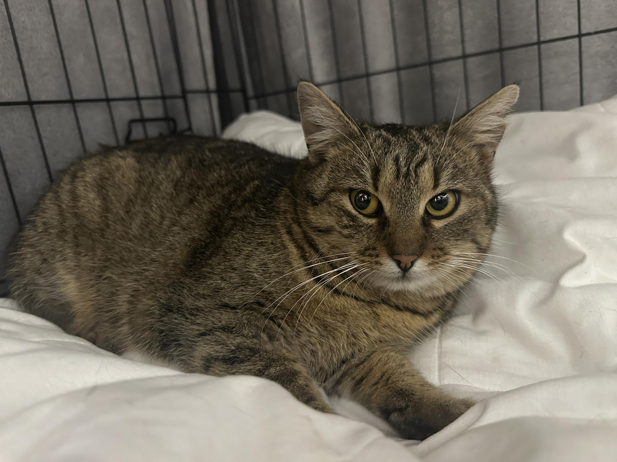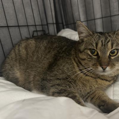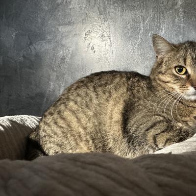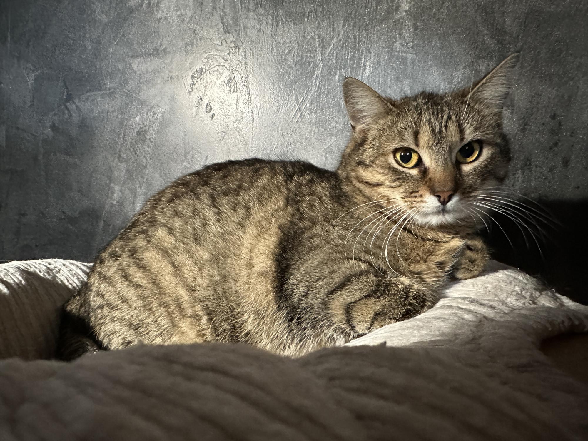 Kočka se k nám dostala z lokality, kde po ní meli lidé střílet. Je bázlivá, ale v náruči přede.