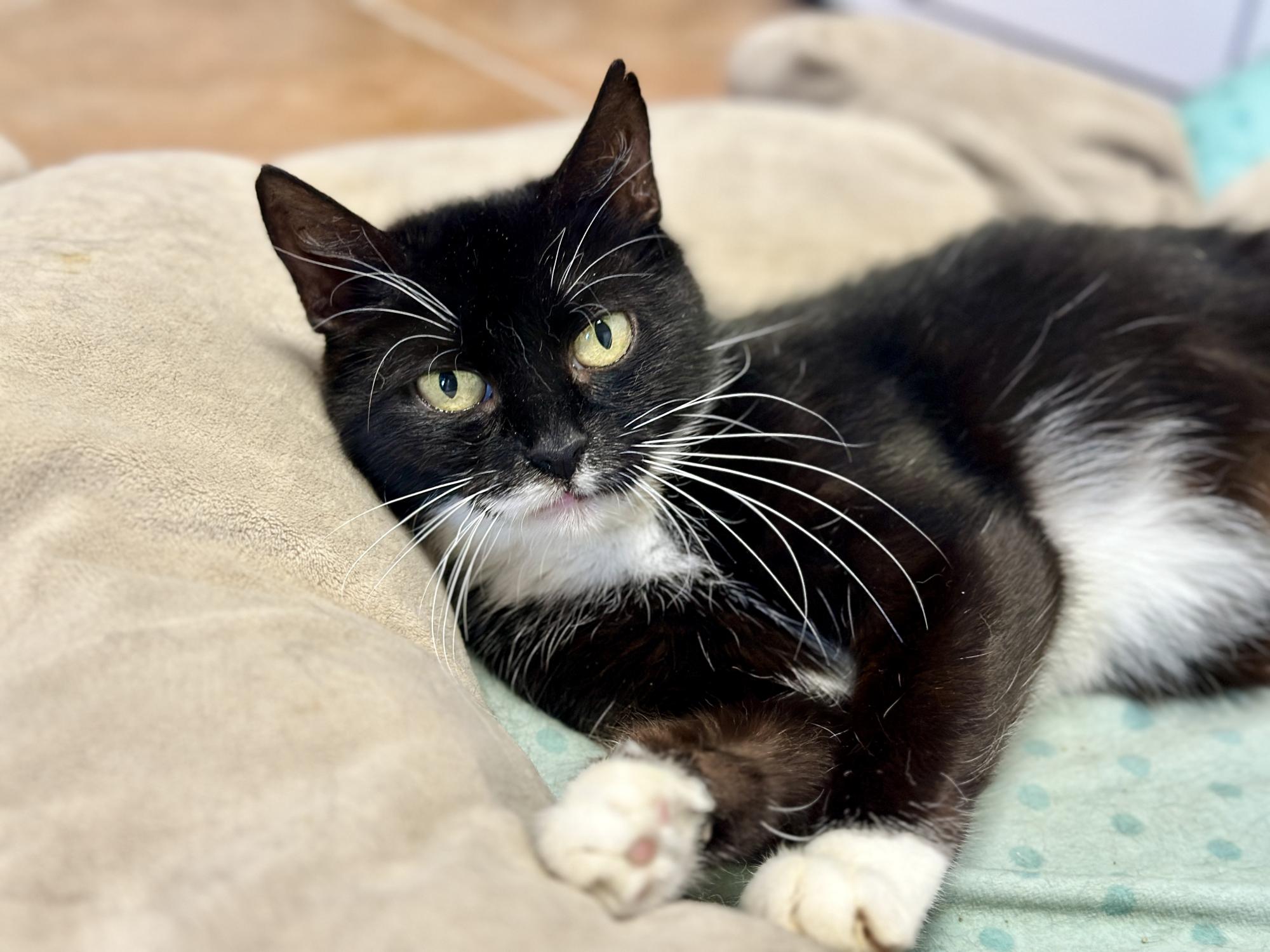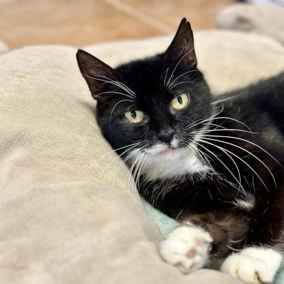 Matka tří koťa a odrostlé kočky z domu problematické chovatelky. Do útulku přijata i s koťaty, které stále kojí. Během pobytu v útulku byla provedena kastrace a extrakce zkažených zubů.